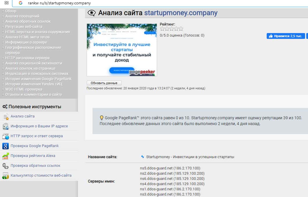 Лохотронская организация StartupMoney Company даже не смогла создать нормальный сайт, и это как раз и показывает один из скринеров веб-доменов. Репутацию, которую набрало по всему разбору это творение, достигло 39 пунктов из 100, что является очень низким показателем и отправляет весь стартап в высокую группу рисков.