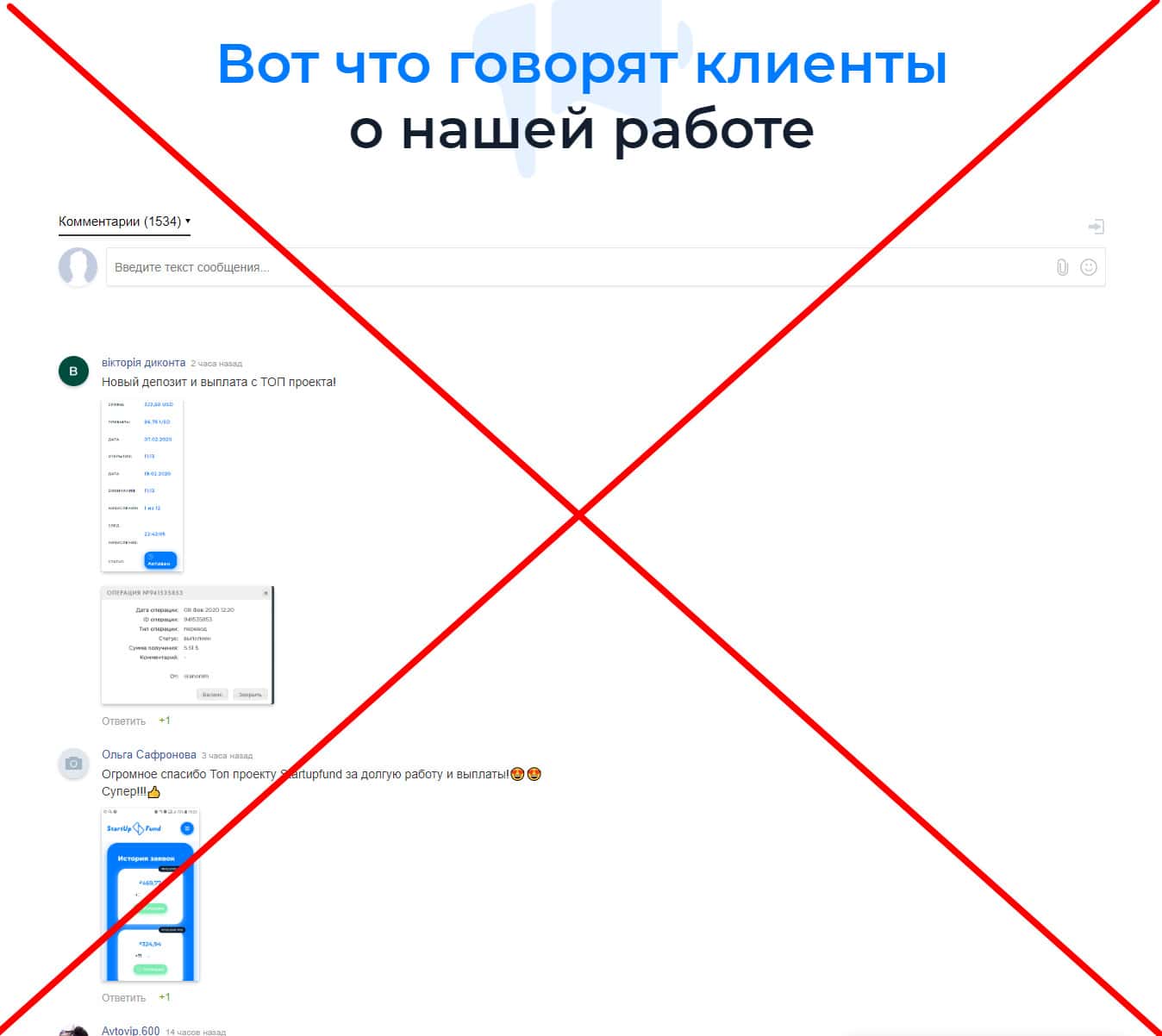 Далее представлен скриншот, на котором указаны фейковые отзывы от проплаченных пользователей сети, либо же это просто аферисты Стартап Мани просто используют свои аккаунты и публикуют не настоящую информацию. Таким образом они вводят в заблуждение пользователей сайта, которые в последующем становятся их жертвами.