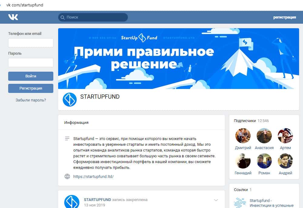 Как уже стало известно, шарлатанская организация StartupMoney Company ведет активную деятельность в социальных сетях, при чем для себя она выбрала именно ВКонтакте. Это связано с тем, что проект направлен на обворовывание именно русскоязычного населения и, что бы вы не попались к ним в лапы, вот ссылка vk com/startupfund
