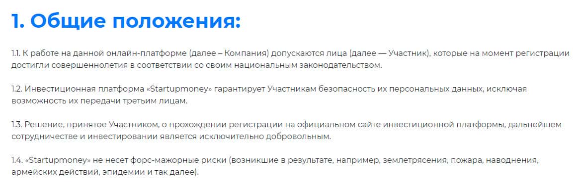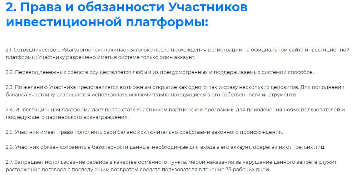 Всего несколькими разделами и пунктами, контора StartupMoney Company пытается объяснить и узаконить взаимоотношение между собой и клиентом. То есть по сути есть множество лазеек, через которые мошенники могут увильнуть и выйти сухими без воды, а вот жертва останется ни с чем.