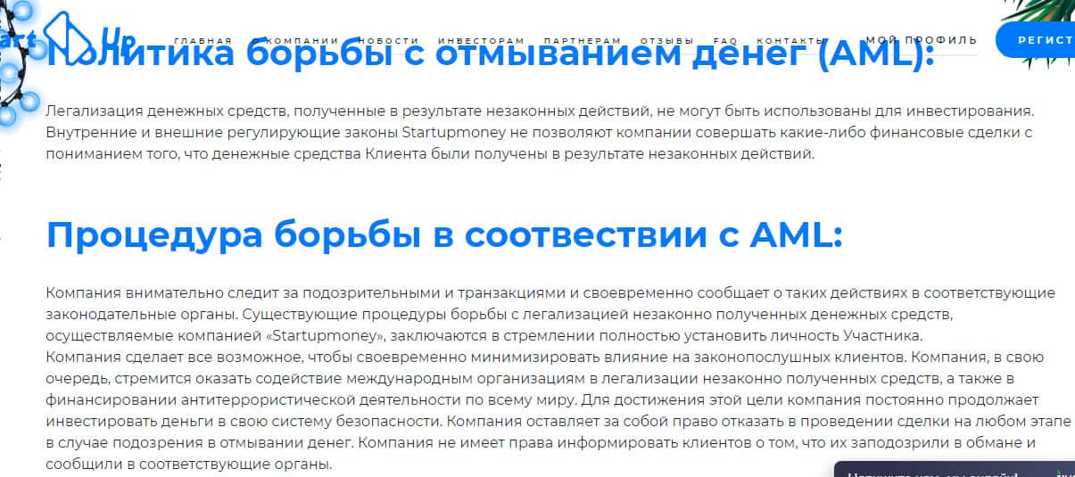 На своем сайте аферисты StartupMoney Company опубликовали политику по борьбе с отмыванием денег, но в тоже время сами являются участниками такого преступления. Процедура не имеет значение, так как это высшая мера цинизма и как правоохранительные органы закрывают на это глаза - вообще удивляет.