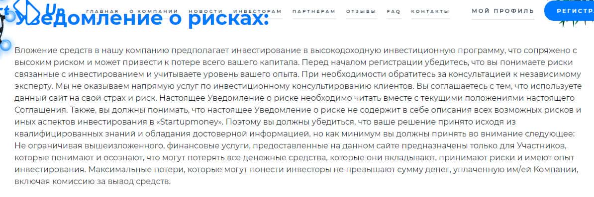 Лохотрон StartupMoney Company не исключает варианты, касательно потери всех вложенных средств клиентов. То есть об этот раздел сразу же разбиваются все гарантии и обещания, о которых так громко говорят шарлатаны. То есть если вы вложите деньги, то вряд ли вернете что-либо обратно.