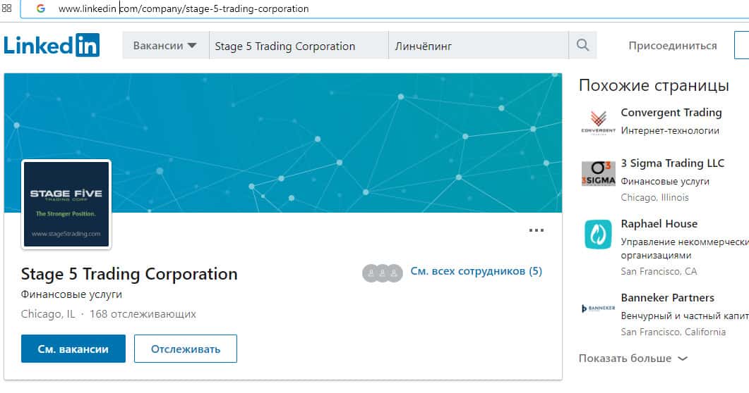 Не густо конечно по подписчикам на Linkedin: на такой возраст брокера и такой масштаб, который аферисты Стэдж 5 Трейдинг описывают, 168 подписчиков довольно скудный результат. но все же эта страница существует и расположена linkedin com/company/stage-5-trading-corporation