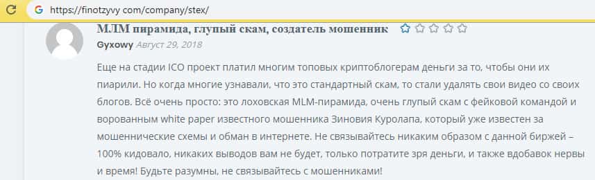 - Негативный комментарий жертвы лохотрона Стекс на одном из интернет-ресурсов