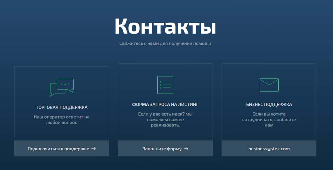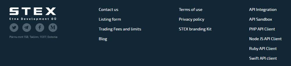 Под свои довольно сомнительные контакты аферисты Стекс не отводили отдельный раздел своего сайта, вместо этого жулики Stex разместили свои контакты в конце подвального сайта. Контактов у шулеров Stex довольно мало, что говорит об их не особом желании иметь дело с наивной клиентурой.