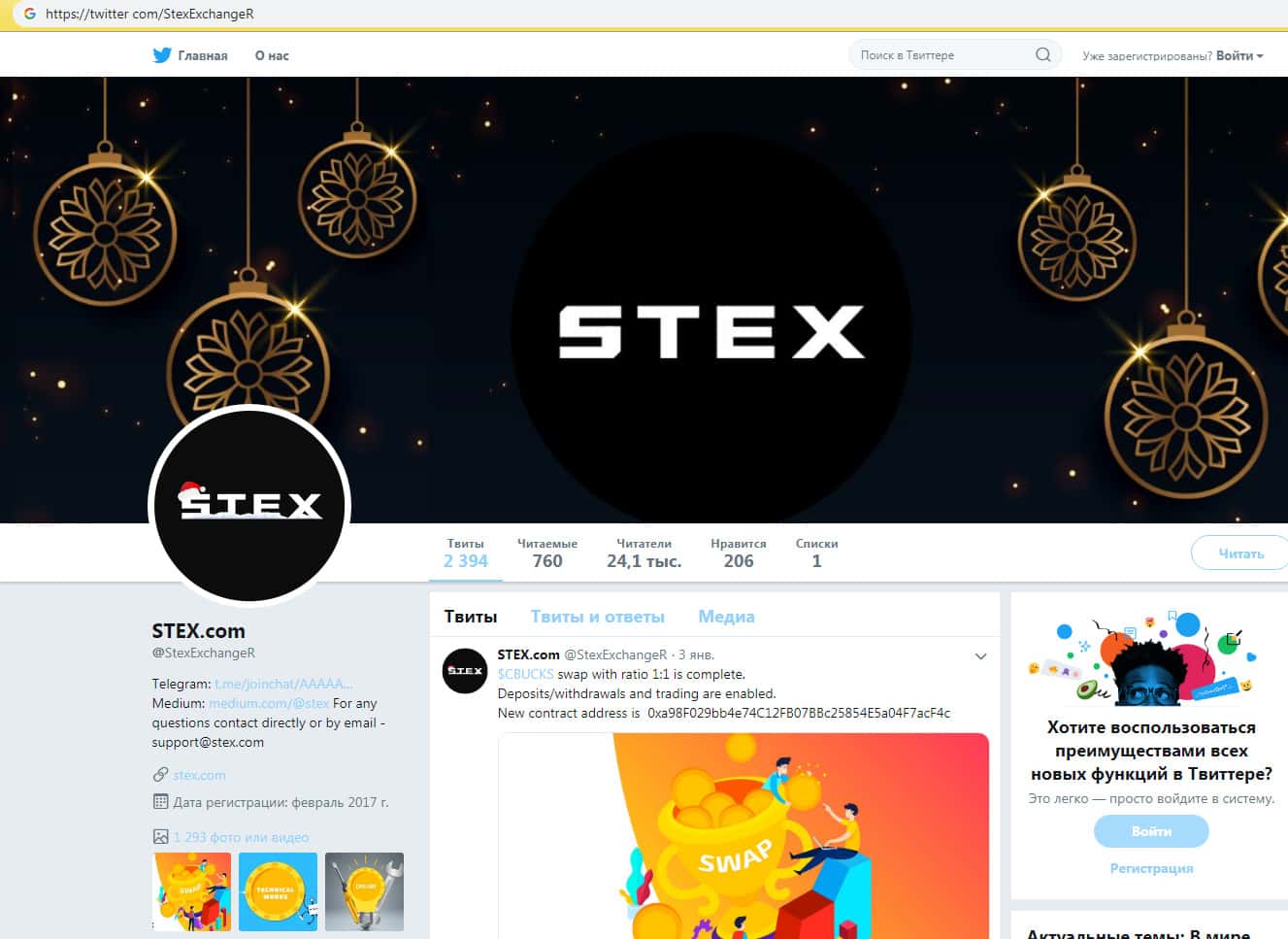 Кроме того, аферистов Stex есть и страница в социальной сети Твиттер, где у шулеров Стекс размещена довольно стандартная и типичная лапша на уши и накручено несколько тысяч подписчиков. На изображении, расположенном ниже, вы можете наглядно увидеть страницу аферистов Stex в социальной сети Twitter.