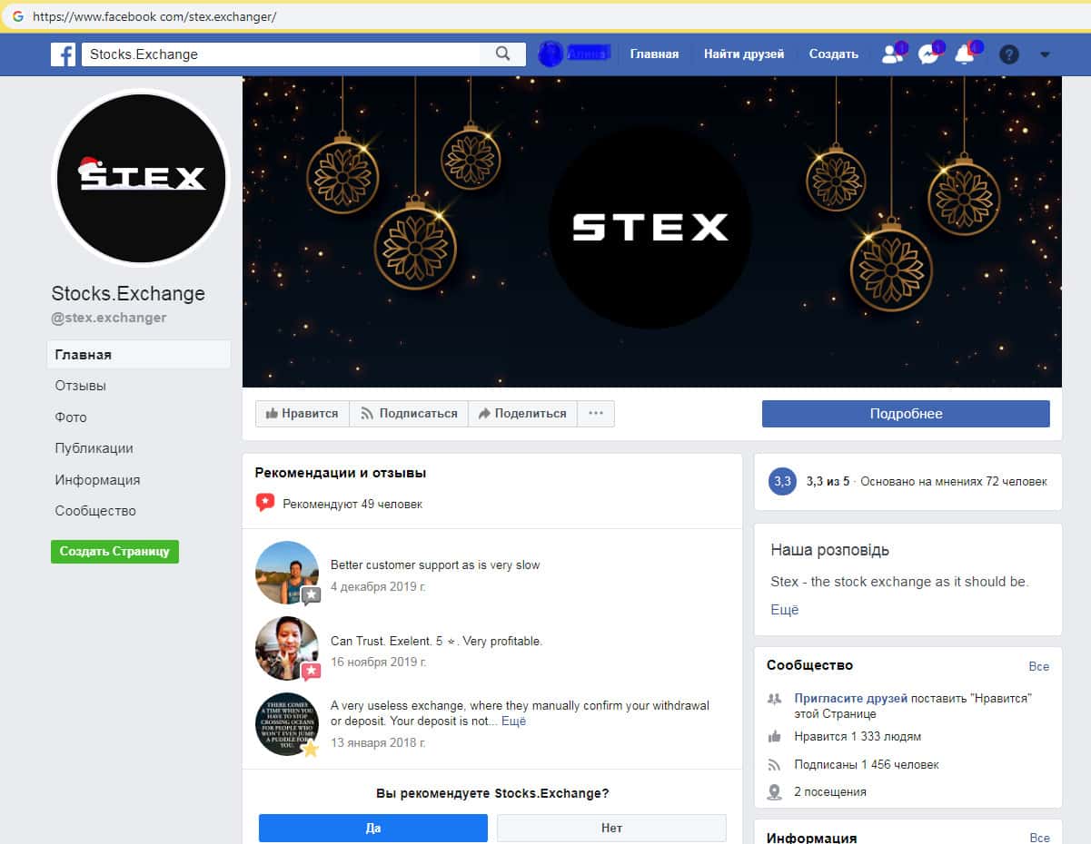Дабы соответствовать современным трендам шулера Stex создали себе страницы в социальных сетях, одной из которых является Facebook, где у мошенников Стекс имеется чуть более тысячи подписчиков. На изображении, расположенном ниже, вы можете увидеть внешний вид страницы проходимцев в социальной сети Фейсбук.