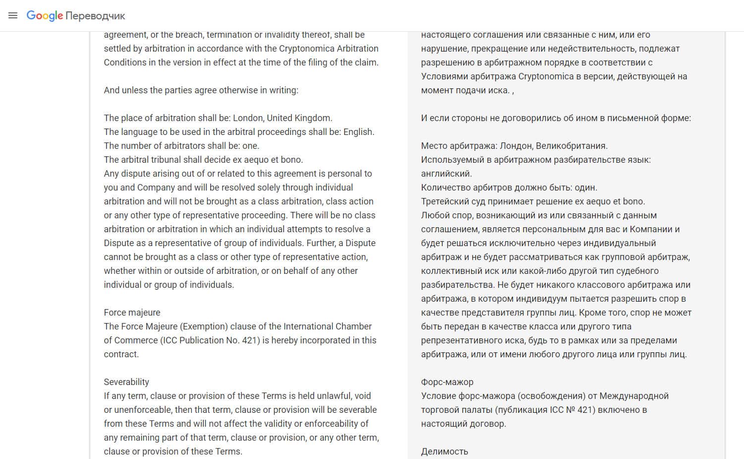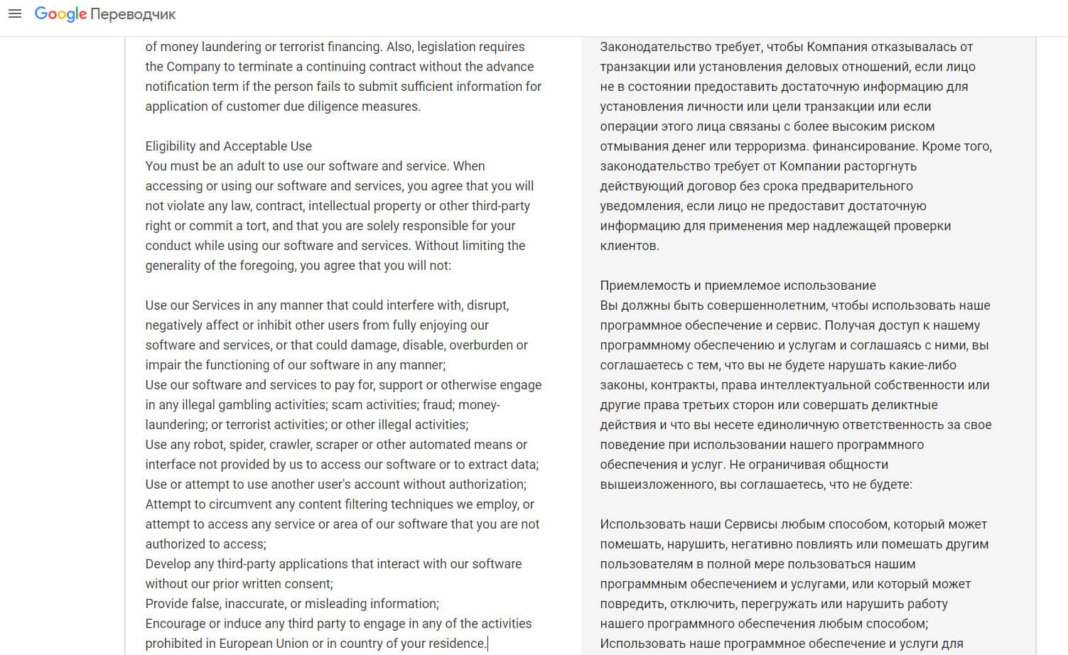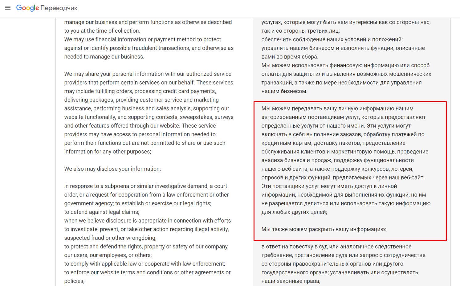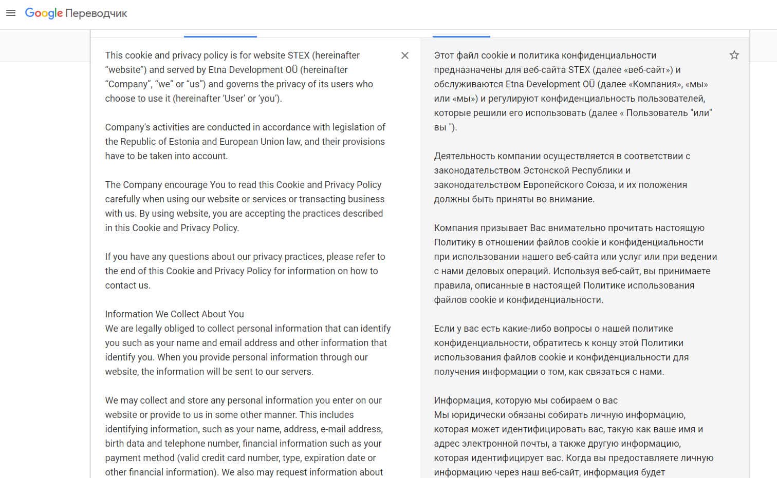 Подвальная контора не предусмотрела русификации, и даже не организовала автоматический перевод, поэтому пользователи могут прочитать документ о политике конфиденциальности компании Стекс только воспользовавшись переводчиком. На изображении ниже представлен перевод раздела условий политики жуликов Stex.