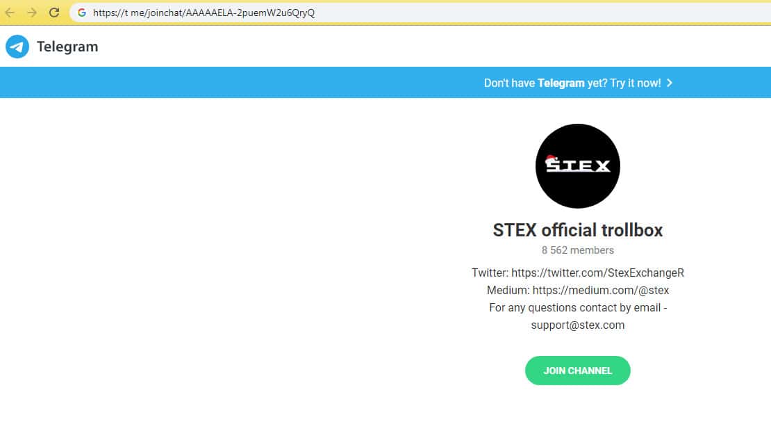И последняя социальная сеть аферистов Стекс - это аккаунт Телеграм под названием STEX official trollbox, где у шулеров Stex размещена довольно стандартная и типичная лапша на уши и накручено более восьми тысяч подписчиков. На изображении, расположенном ниже, вы можете наглядно увидеть страницу аферистов Стекс в социальной сети Telegram.