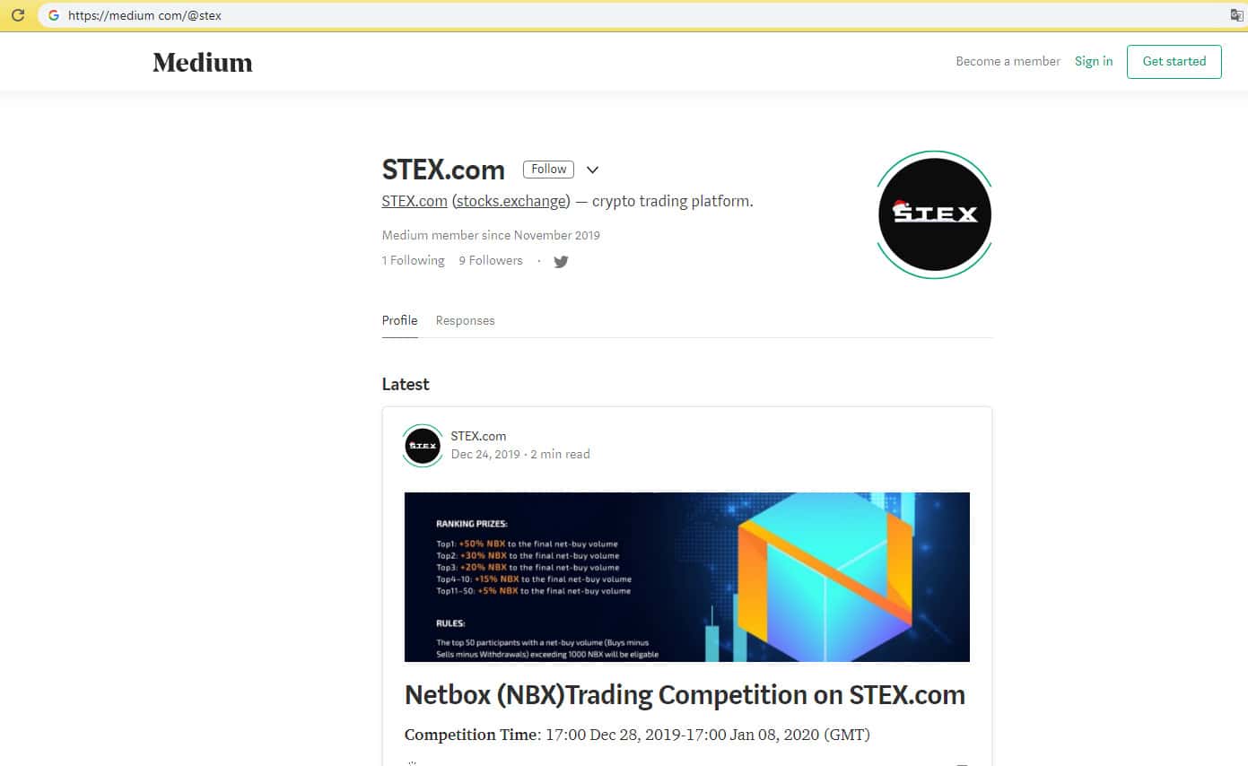 Для размещения различных заманчивых постов с лапшой на уши наивной клиентуре аферисты Стекс обзавелись страницей в социальной сети Medium, где у мошенников Stex имеется всего 9 подписчиков. На изображении, расположенном ниже, вы можете увидеть страницу аферистов Стекс на площадке Медиум.