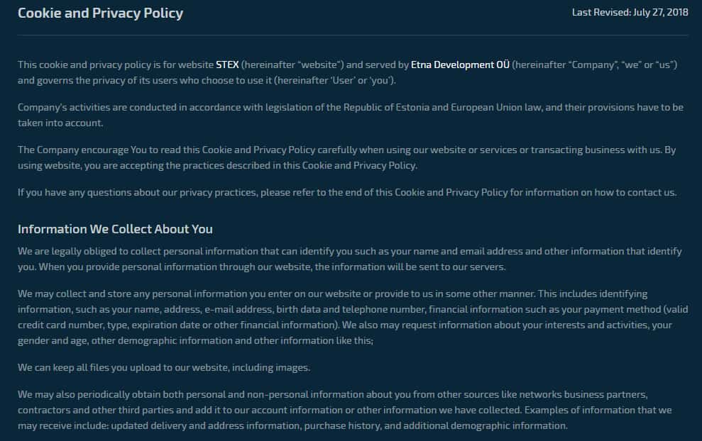 Политика конфиденциальности у аферистов Стекс начинается со стандартной воды о том, что это за документ и зачем он нужен, в ходе которой мошенники Stex говорят о том, что пользователи обязаны сливать свои данные лохотрону Стекс. На изображении ниже вы можете увидеть начало политики конфиденциальности шулеров.