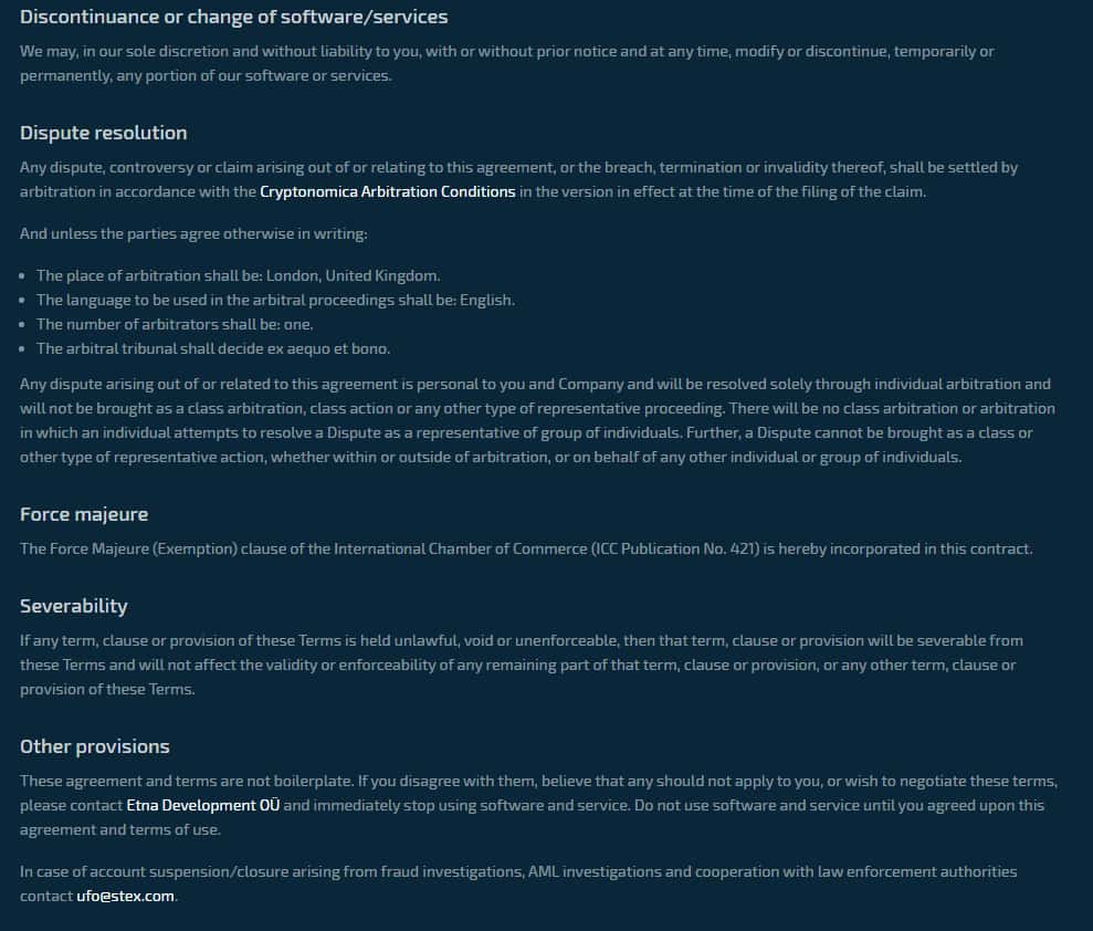 После в условиях сотрудничества у жуликов Stex следует уже полный отказ от гарантий и ответственности за любые потери наивных пользователей, связанные с аферистами Стекс, что прямо говорит о том, что контора жуликов Stex является банальным разводом наивных пользователей на ввод средств.