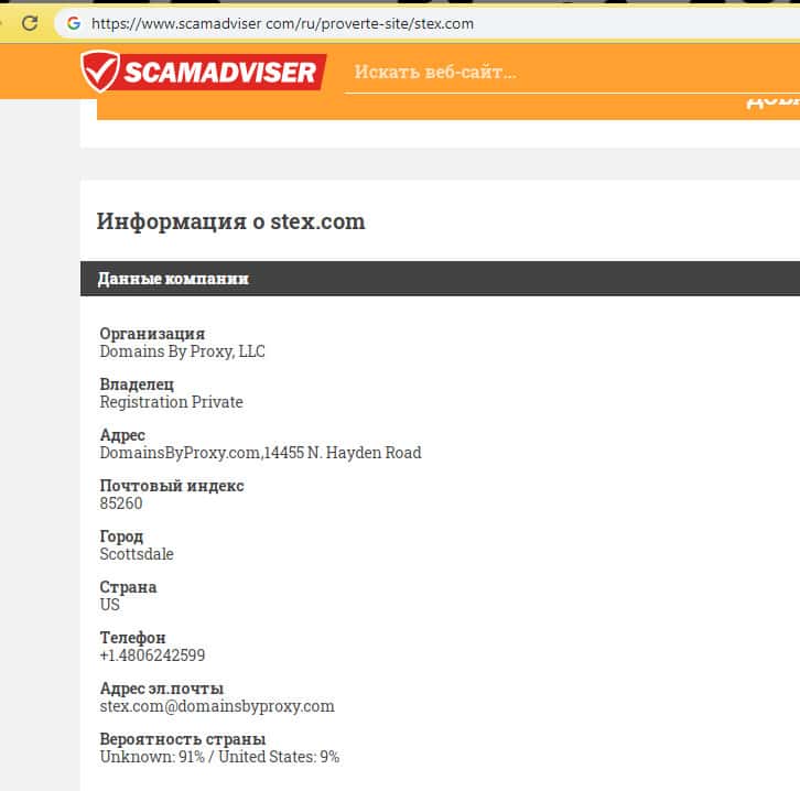 В связи с мошеннической и противозаконной деятельностью лохотрона Стекс его реальные руководители предпочитают анонимность дабы избежать ответственности со стороны правоохранительных органов. Техническую же информацию о сайте жулья Stex можно узнать с помощью портала scamadviser com, что можно увидеть на изображении ниже.