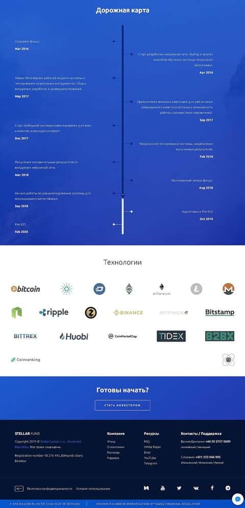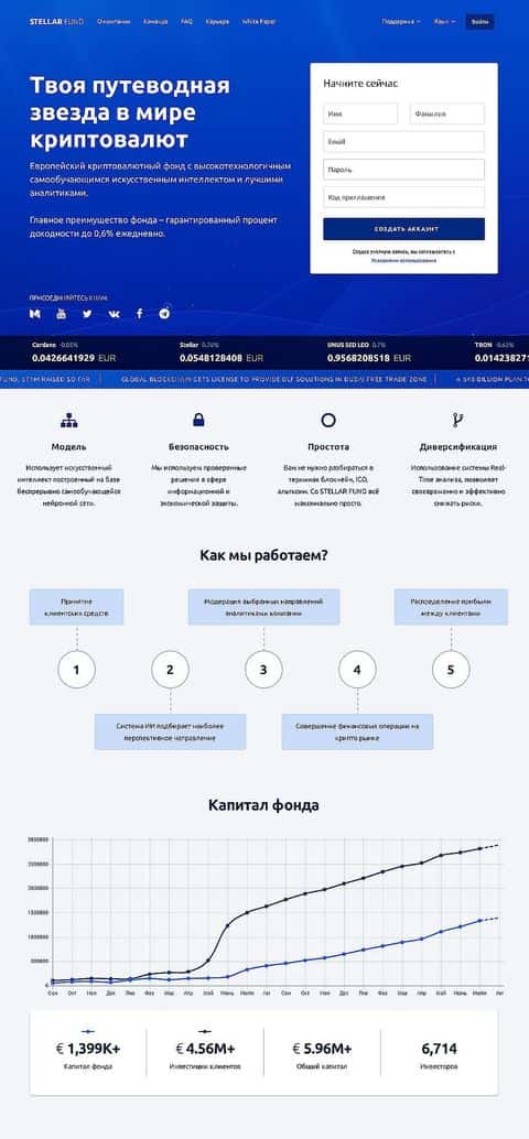 Лохотронщики Стеллар Фонд описывают хайп-легенду, притворяясь разработчиками уникального искусственного интеллекта, способного самостоятельно вести торги. Не предоставляют при этом никаких деталей проекта, фактов или документов, подтверждающих информацию на сайте.
