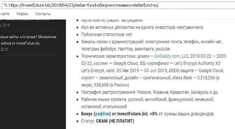По легенде аферисты Stellar Fund представляются криптовалютным фондом. Ресурс, анализирующий hyip-проекты, investfuture biz, отмечает, что, несмотря на низкую доходность (афера планировалась долгосрочной), лохотрон на грани краха: порог входа повышен, публичная статистика закрыта, начинаются проблемы с выводом средств.