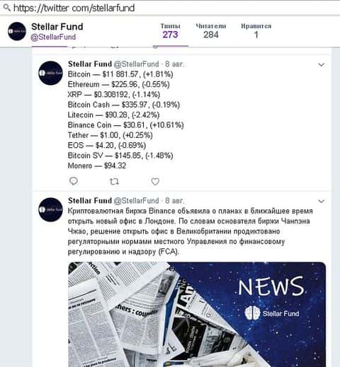 Скаммеры Стеллар Фонд завели страничку и в Твиттере. Здесь у них всего 284 читателя. Страница заполнена нейтральными новостями о курсах криптовалют и событиях на биржах. Так Хайперы Стеллар Фонд пытаются поддержать легенду о том, что являются фондом, который инвестирует средства жертв в криптовалюту.