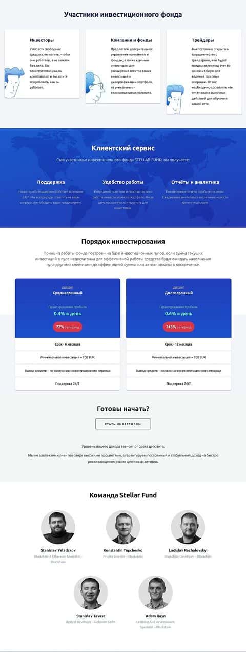 Аферисты StellarFund приглашают инвесторов и трейдеров поделиться с ними деньгами не акцентирую внимание на том, что доходность построена по реферальному принципу. На сайте сказано, что сам проект разрабатывается с 2016 года, что подозрительно, если учесть, что сама страница создана год назад, в 2018.