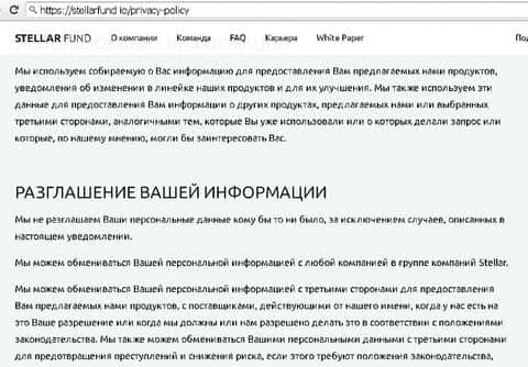 В соглашении о политике конфиденциальности лохотронщики Стеллар Фонд указывают, что собирают информацию о клиентах во время переписок, разговоров, через анкеты и coocies. В договоре мошенники StellarFund оставили себе "лазейку" для слива данных при необходимости.