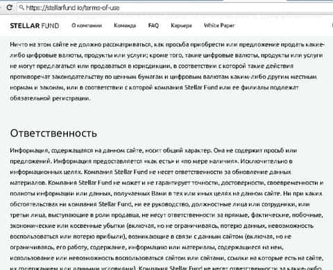 На сайте мошенников Стеллар Фонд есть клиентское соглашение, даже на русском. Странно, что находятся инвесторы, которые после его прочтения соглашаются отдавать свои деньги кидалам. Никакой ответственности фонд не несет, не склоняет ни к каким вложениям, а материалы на сайте - информационного характера.