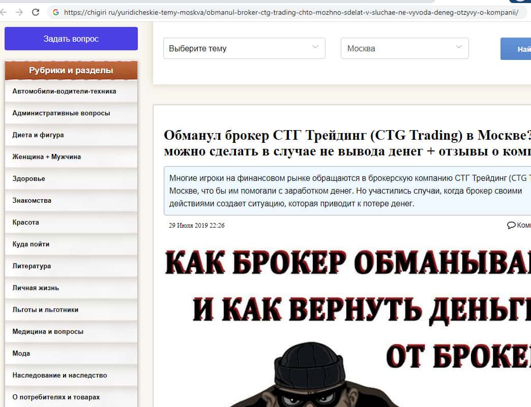 Зачем делать такой глупый раздел, лучше ответе сами своим клиентам. Но компания СТГ Трейдинг таким образом отводит подозрение у ещё ничего не понимающих новичков. Таким образом когда у клиента возникает вопрос о поддержке, лохотрон CTG Trading переводит взгляд клиента на данный фейковый раздел.