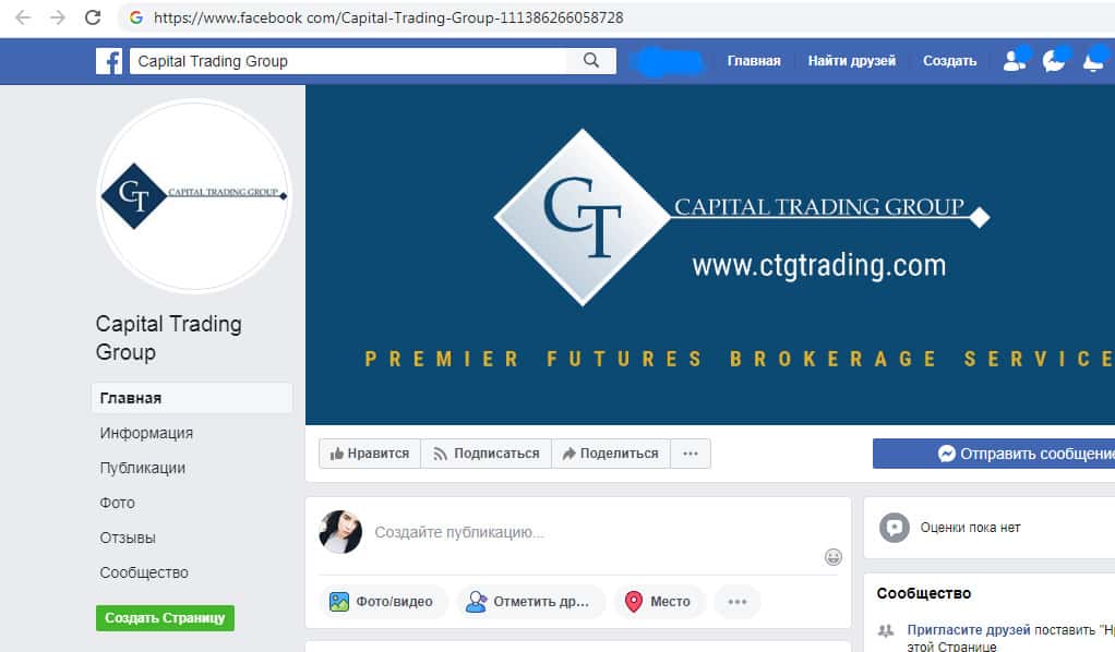 Для размещения различных заманчивых постов с лапшой на уши наивной клиентуре аферисты СТГ Трейдинг обзавелись страницей в социальной сети Фейсбук, где у мошенников CTG Trading имеется несколько тысяч подписчиков. На изображении, расположенном ниже, вы можете увидеть страницу аферистов.