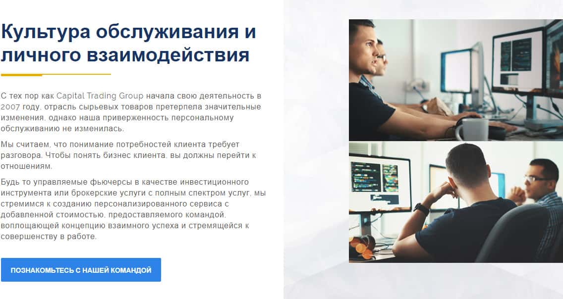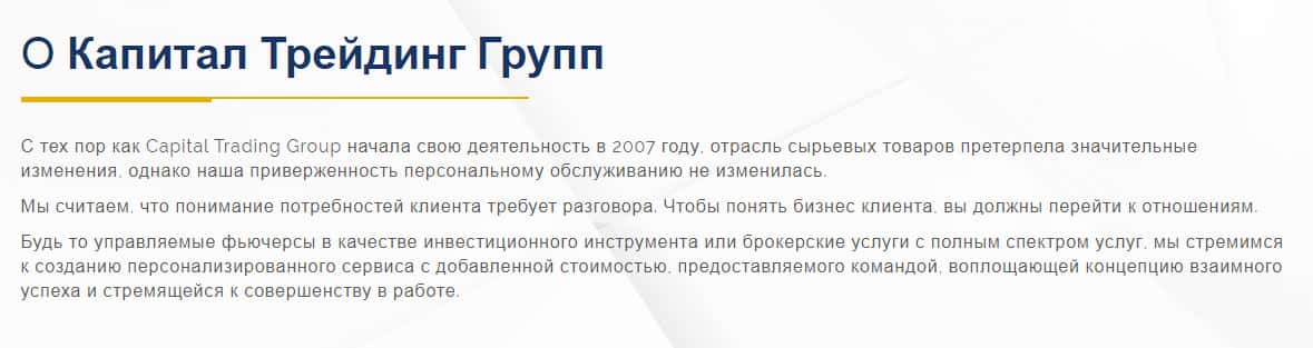 Наверное самый лживый раздел сайта мошенников CTG Trading, в котором аферюги рассказывают о себе. Каждая строка данного раздела пропитана ложью и непонятной информацией. Где они рассказывают какие они хорошие, честные и профессионалы. Но не пишут о том, как они обманывают клиентов и сливают их деньги.
