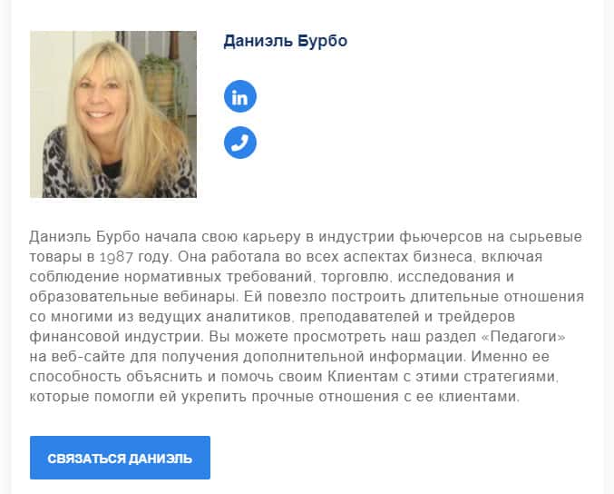 И по завершению на сайте мошенников СТГ Трейдинг мы видим описание карьеры третьего члена команды, который является педагогом и предводителем всей их шарашкиной конторы, через которую и производятся все махинации, связанные со сливом счетов наивной клиентуры. Она придумывает стратегию и помогает все делать красиво.