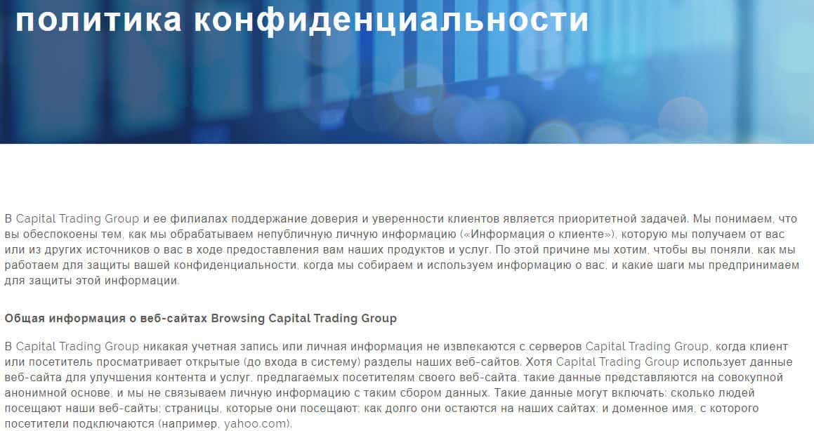 Политика конфиденциальности у аферистов CTG Trading начинается со стандартной воды о том, что это за документ и зачем он нужен, в ходе которой мошенники СТГ Трейдинг говорят о том, что пользователи обязаны сливать свои данные лохотрону CTG Trading. На изображении ниже вы можете увидеть начало политики конфиденциальности шулеров.