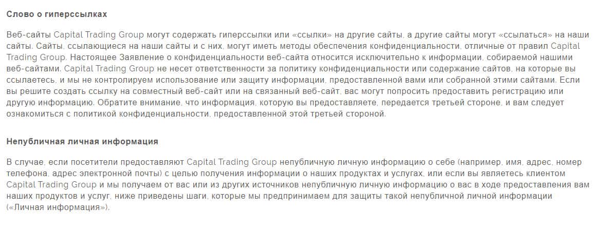 Далее в политике конфиденциальности у аферистов СТГ Трейдинг следует стандартный раздел о том, что такое личные данные и зачем мошенники CTG Trading собирают их у наивной клиентуры. На изображении, расположенном ниже, вы можете наглядно увидеть следующий раздел политики конфиденциальности лохотрона СТГ Трейдинг.