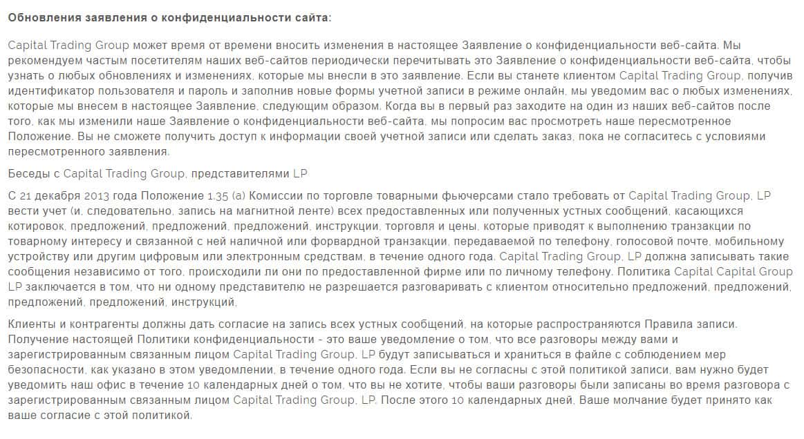 Завершается же политика конфиденциальности у мошенников CTG Trading довольно типично и ожидаемо, а именно условием о том, что жулье СТГ Трейдинг может в любой момент по своему усмотрению изменить данные условия политики конфиденциальности. На изображении ниже вы можете увидеть окончание политики шулеров CTG Trading.