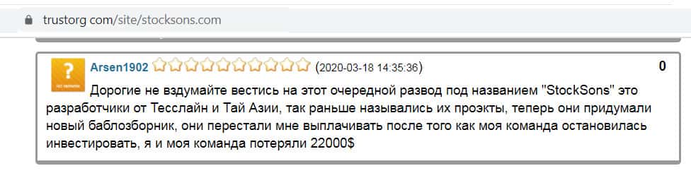 - StockSons типичный хайп-проект мошеннической конторы, пишет в отзыве некий SamSonV на сайте trustorg com
