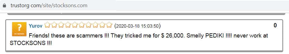 Обманутые аферистами Сток Санс клиенты пишут отзывы в сети интернет, чтобы предостеречь других трейдеров от подобных ошибок. Так на информационном сайте trustorg com найден отзыв некого Yurov, в котором говорится, что компания StoskSons присвоила его 26 000 долларов.