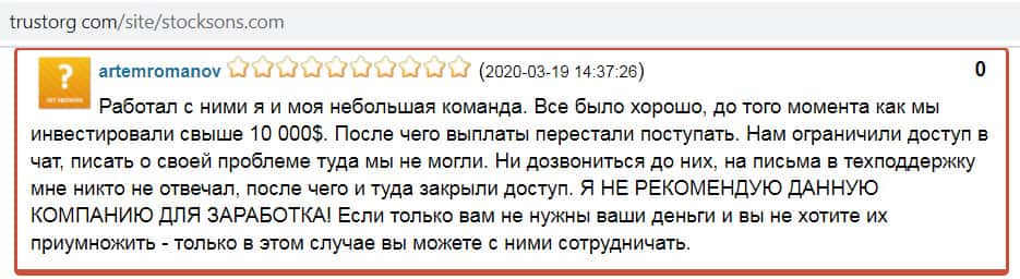 - Отзыв с сайта trustorg com клиента StockSons с ником artemromanov, потерявшего 10 000 долларов