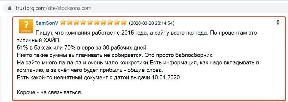На информационном портале trustorg com найден отзыв некого SamSonV, который пишет, что сайту конторы StockSons всего полгода, но они умудряются работать с 2015 года. Будьте аккуратны и прежде, чем перевести деньги стоит очень внимательно изучить информацию о выбранной компании в сети интернет.