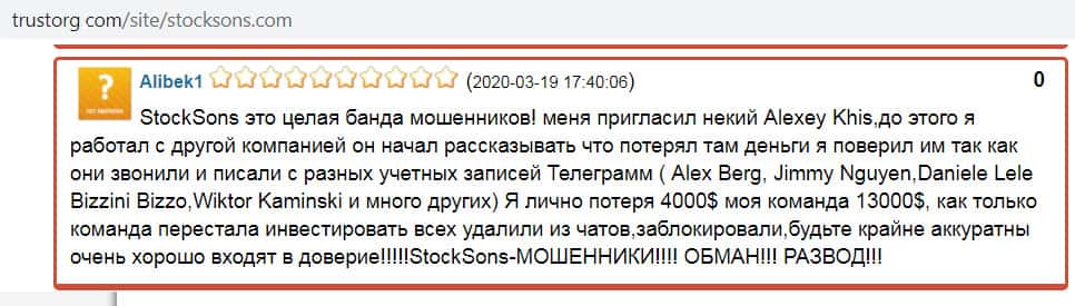 Там же на портале trusorg com отзыв оставил некий Alibek1, рассказавший свою историю развода мошенниками из Stock Sons. Трейдер имел неосторожность инвестировать свои деньги в данную контору. Как только его команда перестала пополнять счета, лохотронщики заблокировали им доступ, а деньги обратно не отдали.