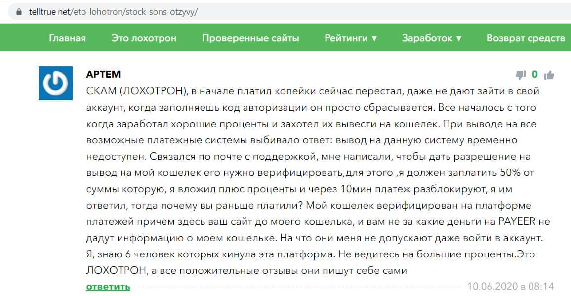 - Контора Stock Sons - лохотрон по мнению некого Артема, его отзыв размещен на веб-ресурсе telltrue net