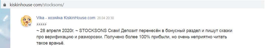 В интернете на веб-сайте otziv-broker com найдена еще одна публикация о том, что StockSons - это сомнительная инвестиционная платформа и лучше с ними не связываться, так как уже имеются потерпевшие, которых обманули эти мошенники. Мы не рекомендуем выходить с ними на связь.