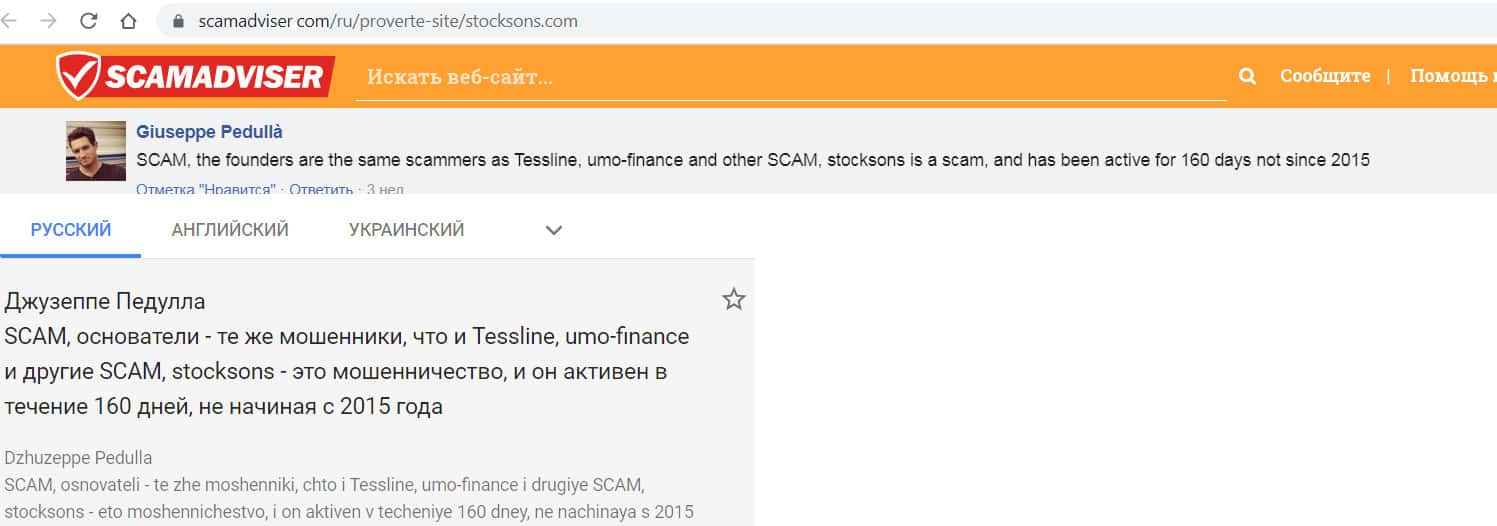 - Отзыв некого Giuseppe Pedulla с веб-ресурса scamadviser com о том, что компания Stock Sons мошенники