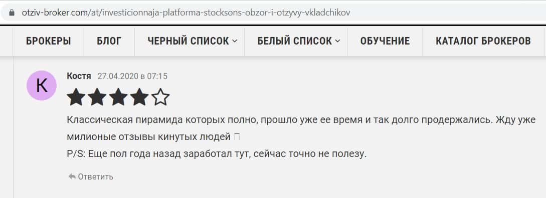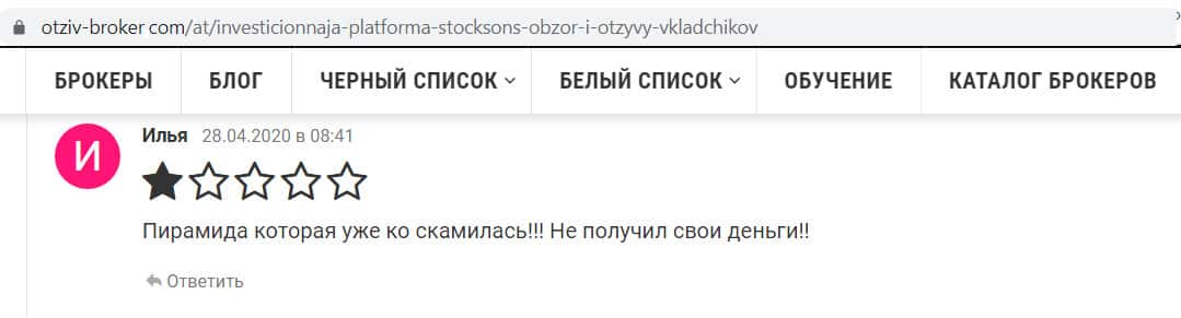 Пользователь с именем Илья пишет на сайте otziv-broker com, что работа компании StockSons больше похожа на финансовую пирамиду и предупреждает, что вывести свои деньги вряд ли получится, по крайней мере у него это сделать не получилось. Держитесь подальше от мошенников.