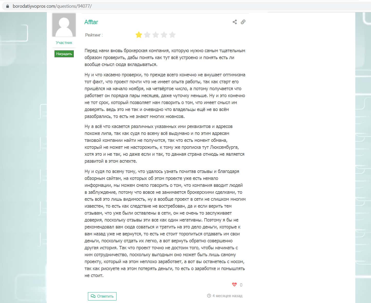 Пользователь под ником Afftar на сайте borodatiyvopros com оставил негативный отзыв о компании StockCons