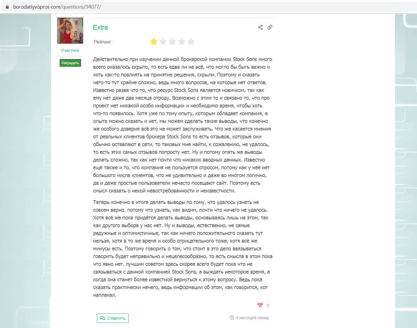 Низко оценил деятельности жуликов Сток Санс на ресурсе borodatiyvopros com пользователь с никнеймом Optiv. Он пишет, что в сети о мошенниках очень мало отзывов, регистрация вызывает сомнения, мало инфы о самой конторе, все это в совокупности не вызывает доверия к StockSons.