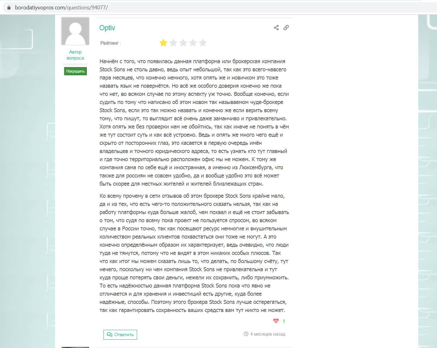 Оценка деятельности скам-конторы StockSons неким Optiv с ресурса borodatiyvopros com