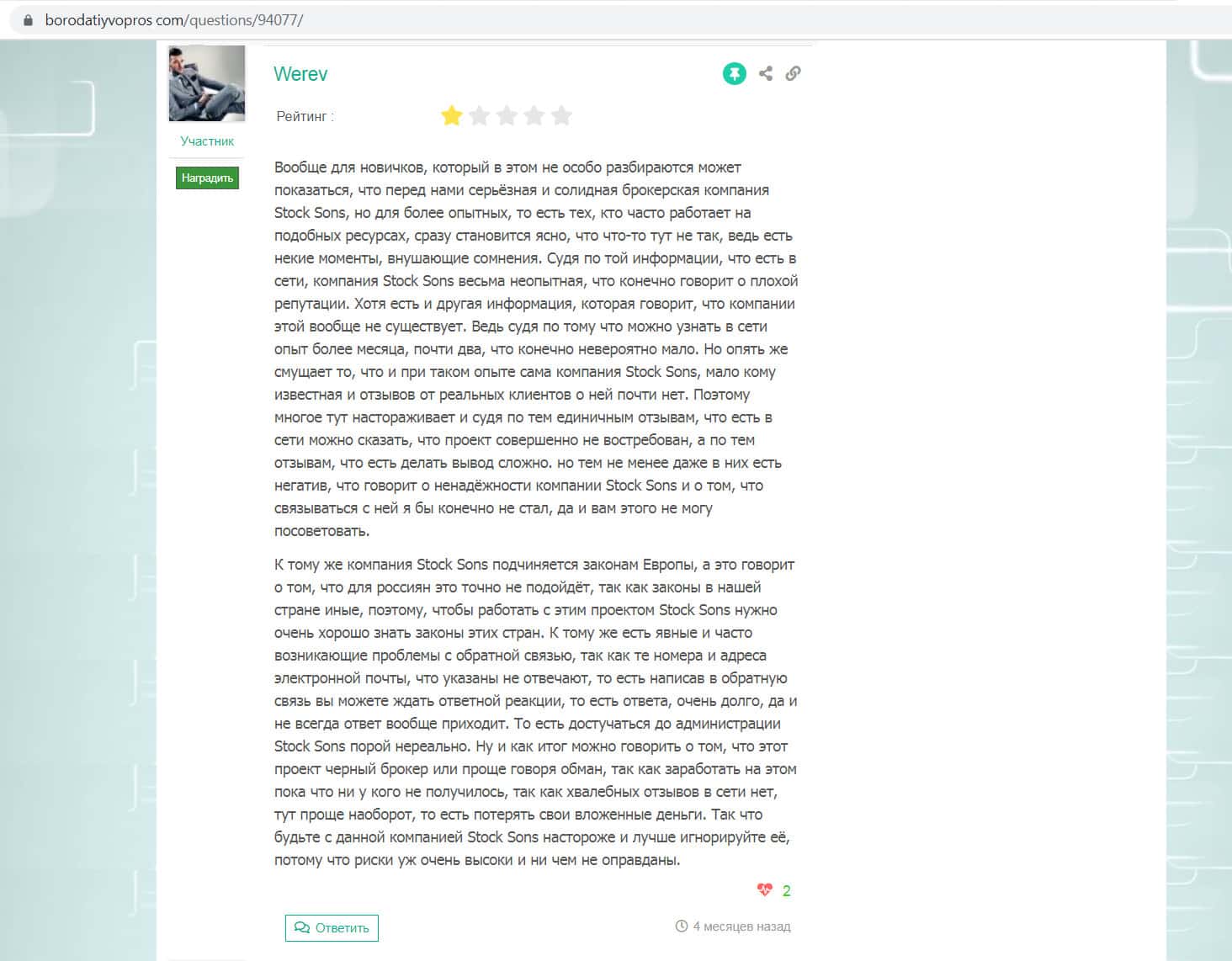 Отзыв некого Werev с портала borodatiyvopros com, в котором он отрицательно оценил работу брокера Стокс Санс