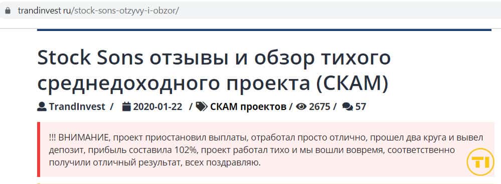 - Портал trandinvest ru предупреждает пользователей о том, что компания Stock Sons перестала выплачивать прибыли