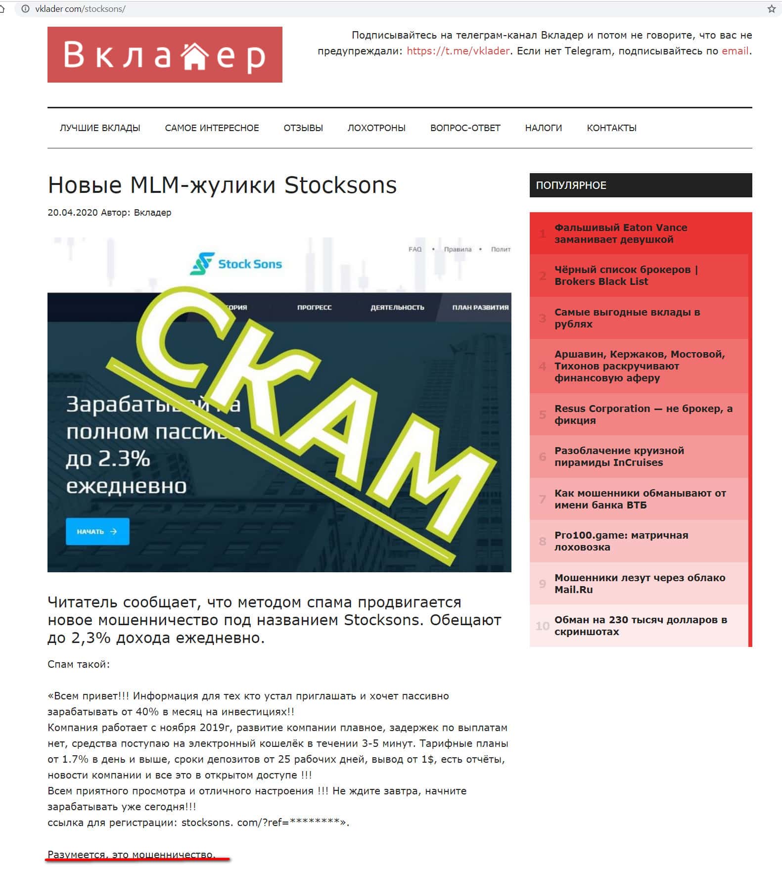 - Мнение автора отзыва о scam-конторе StockSons, размещенное на портале vklader com