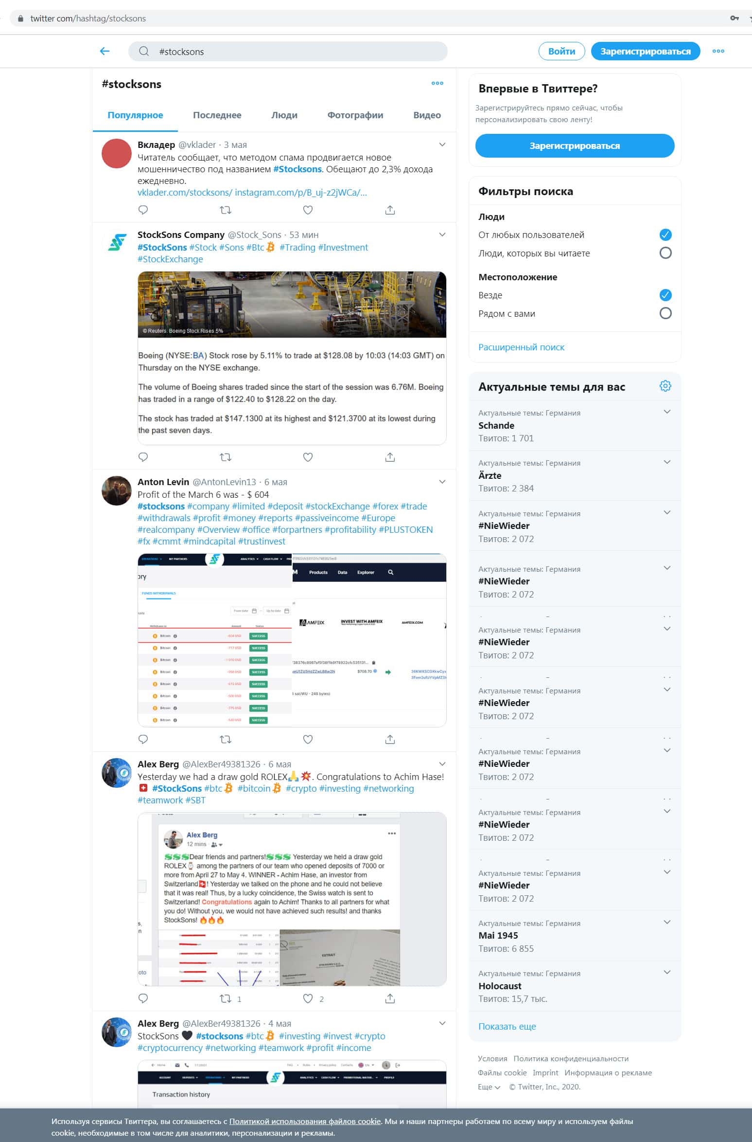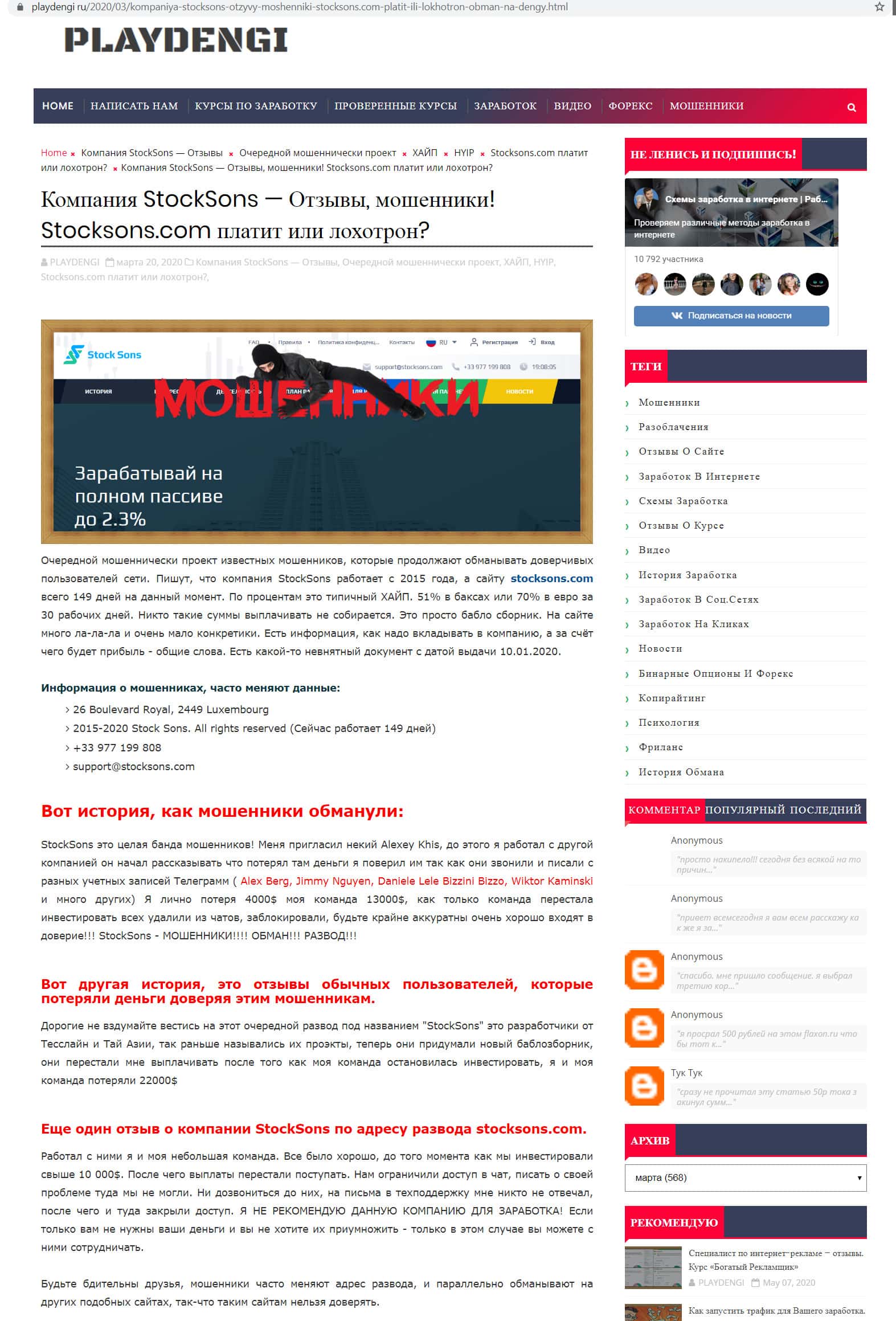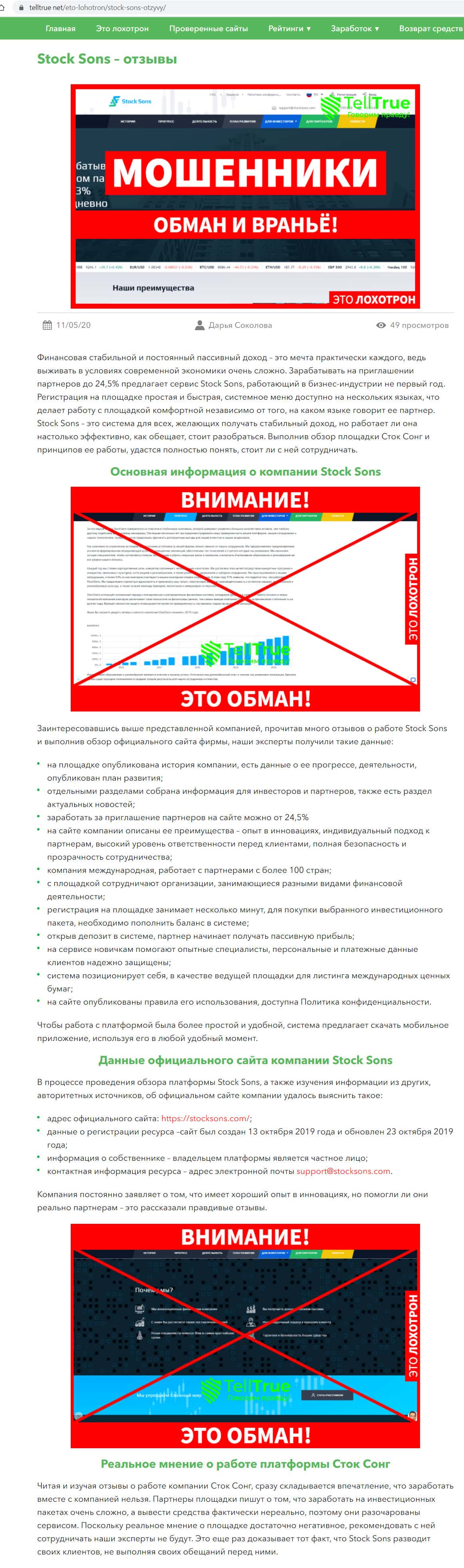 Найдена еще одна негативного содержания статья о деятельности СтокСанс, написанная некой Дарьей Соколовой. Она достаточно подробно поясняет почему называет данную контору мошенниками, обманывающими наивных людей в сети интернет. Запомните, компания Stock Sons - ОБМАН !!!