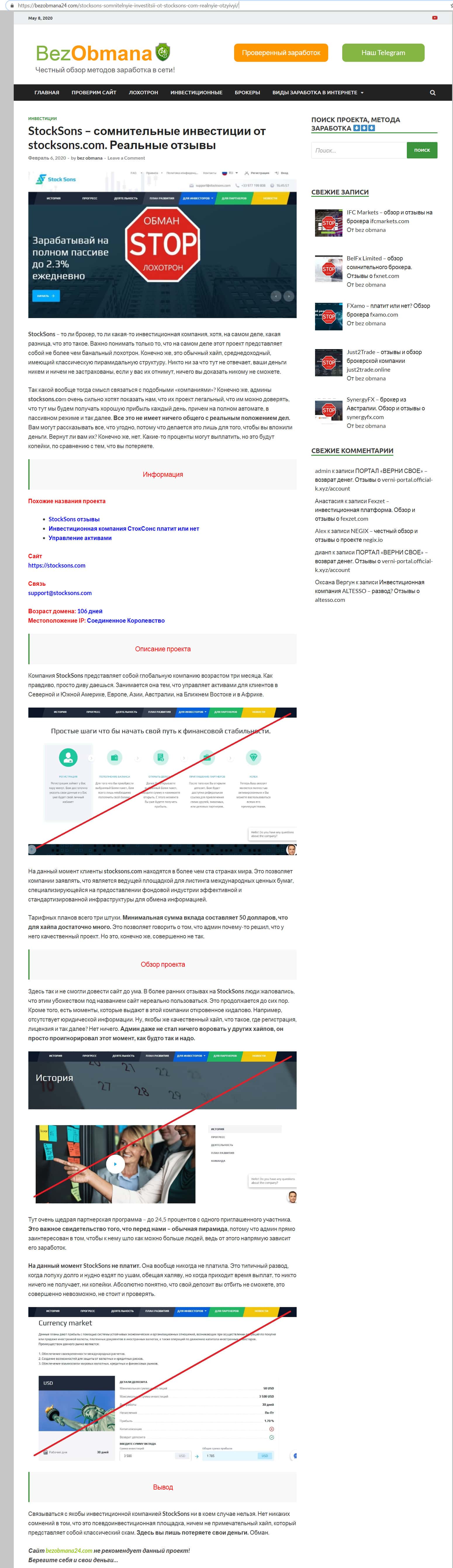 На просторах интернета найдена публикация, которая так же приводит доводы о том, что связываться с конторой Stock Sons нельзя, они мошенники. Подробно ознакомиться с данной статьей можно на сайте broker-investor com. Рекомендуем не вкладывать деньги в скам-проект, это очень опасно.