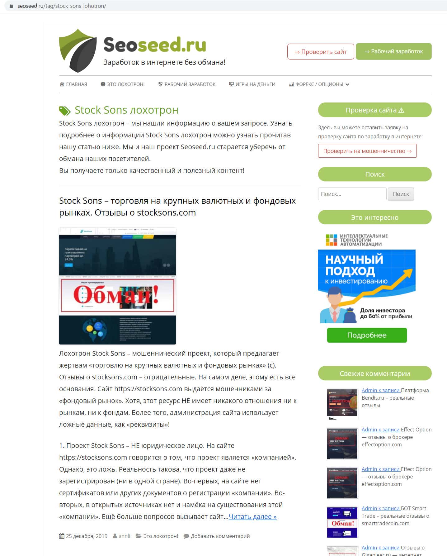 Статья о мошенничестве конторы Stock Sons, размещенная на ресурсе seoseed ru