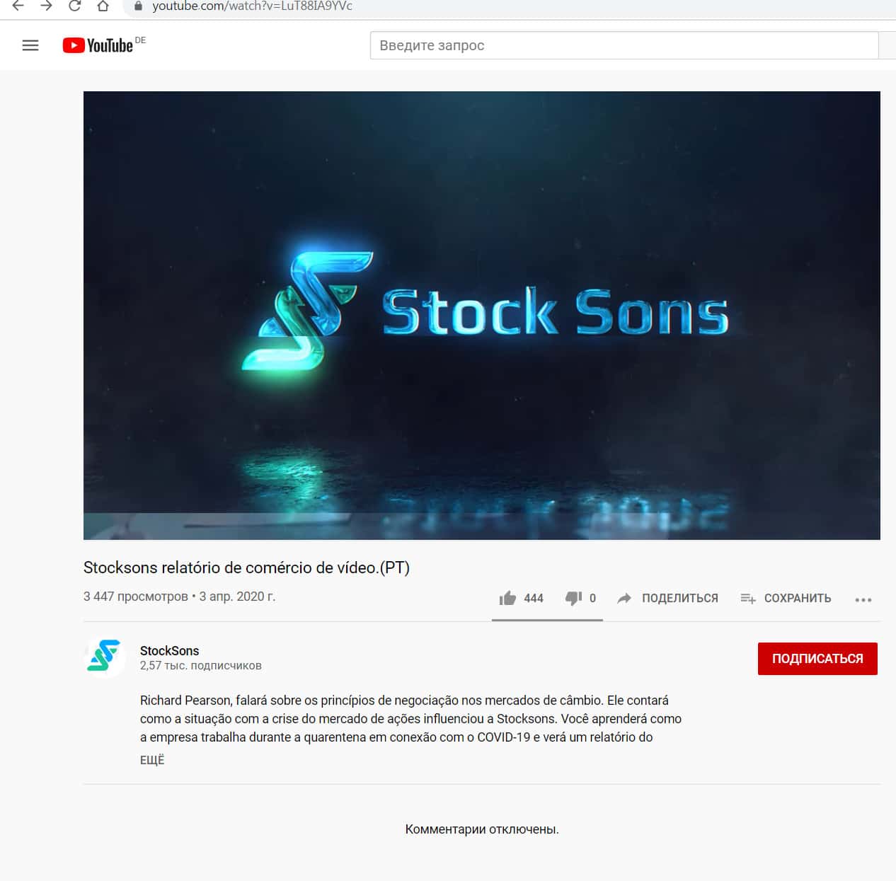На YouTube com брокер СтокСанс отключил комментарии к своему официальному каналу