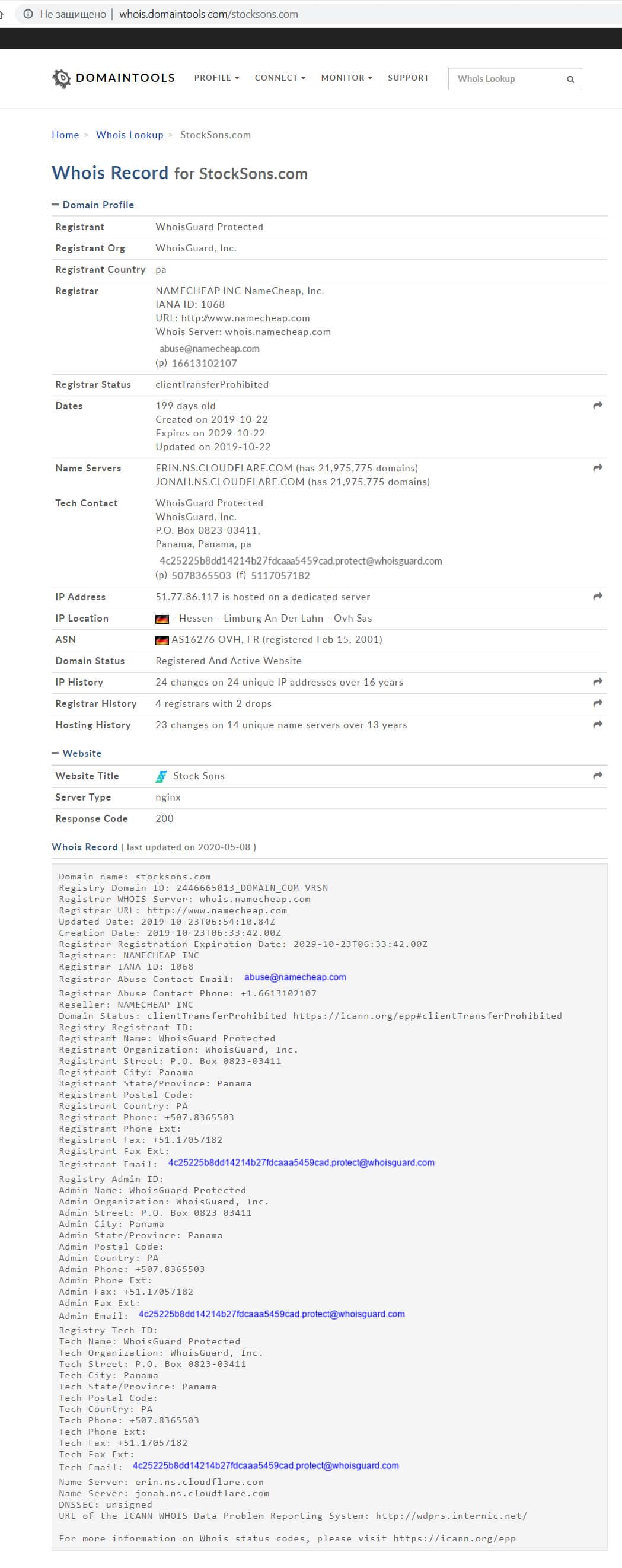 Проверка сайта stocksons com на специализированных порталах trustorg com и whois.domaintools com